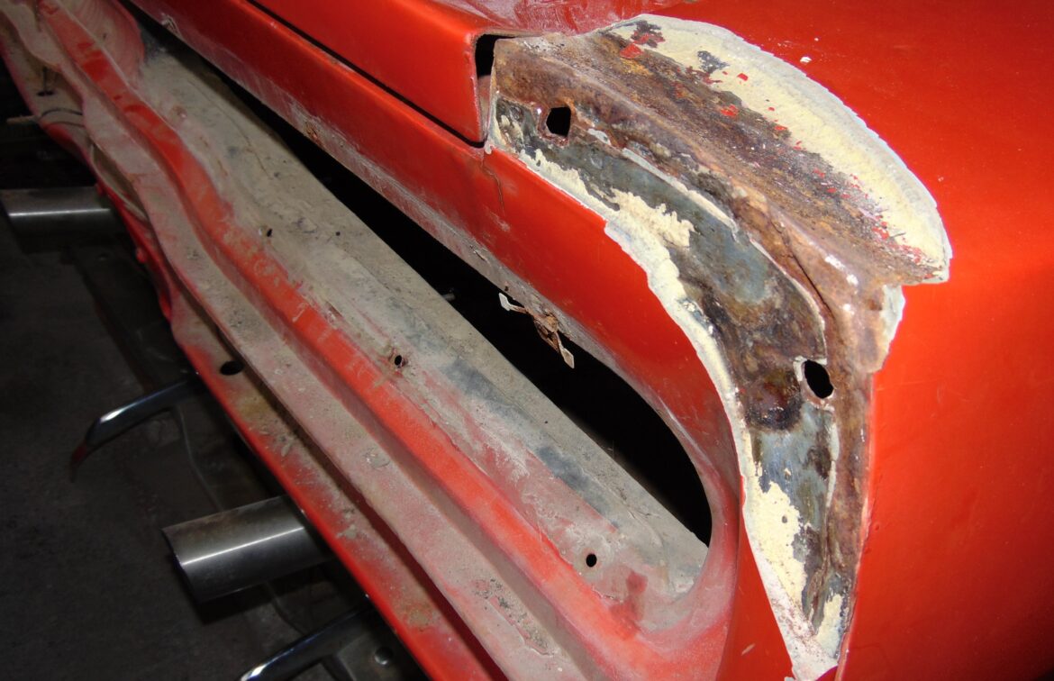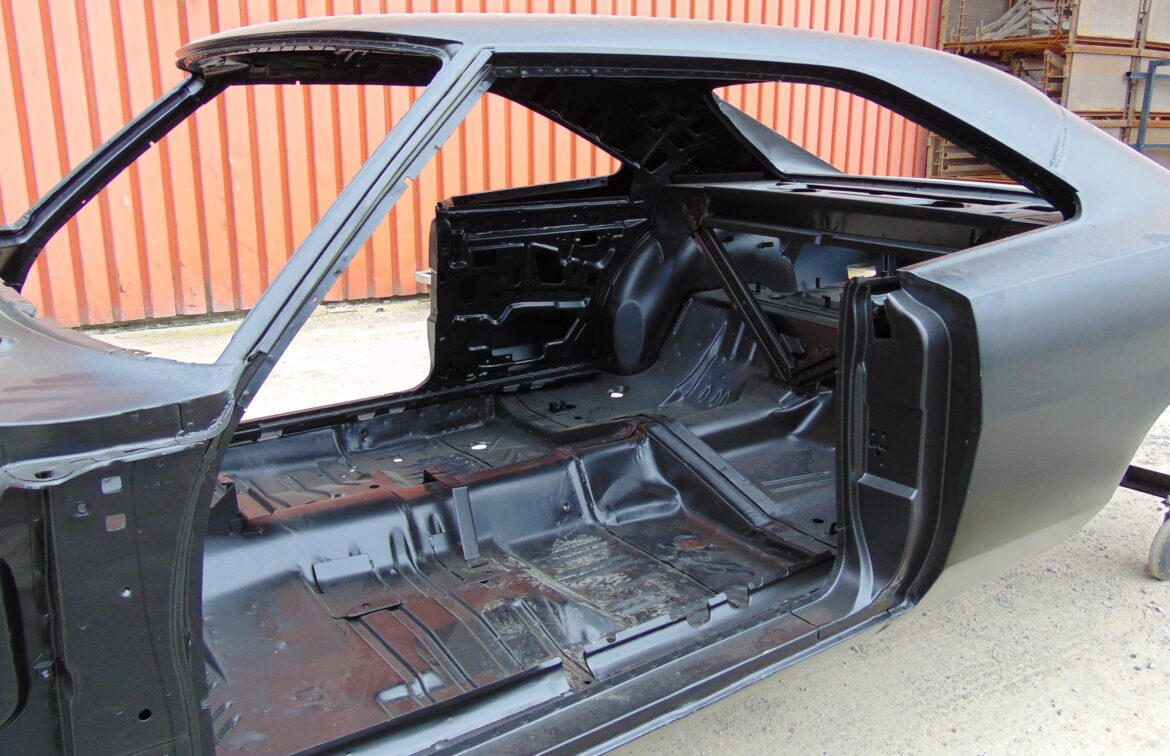 Zunächst zerlegen wir die Karosserie vollständig. Anschließend wird sie entlackt und sowohl im Strahlverfahren als auch chemisch gründlich gereinigt, damit Rost und alte Lackschichten vollständig entfernt werden. In Zusammenarbeit mit einer Karosseriewerkstatt werden beschädigte oder korrodierte Bereiche fachgerecht ersetzt. Danach folgt eine mehrschichtige Grundierung und Highend Volllackierung – auf Wunsch entweder im originalen Farbton oder individuell nach Kundenvorgabe.